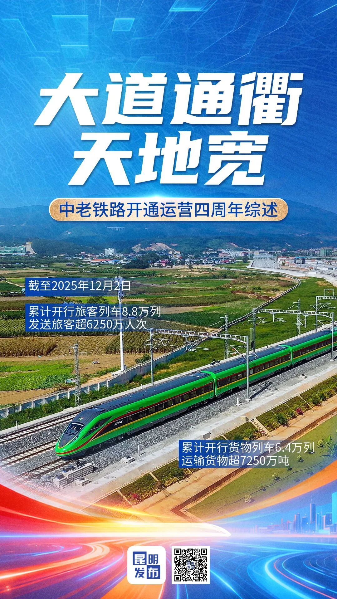 四年来,中老铁路“成绩单”亮眼:截至2025年12月2日,累计发送旅客超6250万人次、运输货物超7250万吨,中老两国之间人享其行、物畅其流、货通天下。中老铁路已成为造福沿线民众的幸福路、发展路、友谊路。